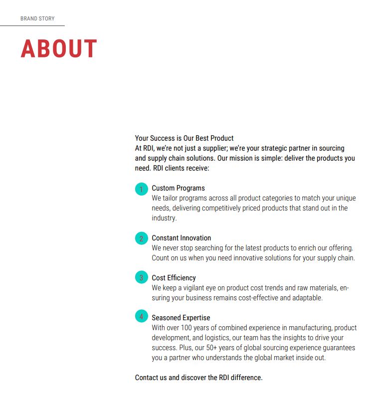 I led a brand refresh for RDI, a hospitality supplier shifting toward a more modern, B2B-focused presence. The goal was to better communicate their value proposition, product range, and partnership benefits through elevated online content. I provided updated copy recommendations and a new approach to text overlay images that positioned RDI as a credible, contemporary choice in a competitive, digital-first buying landscape.